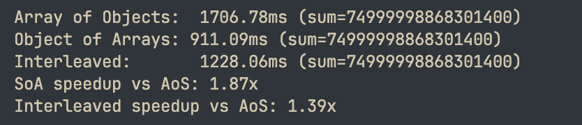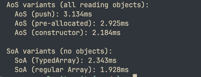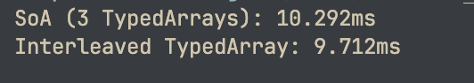 console.log(`SoA: ${timeSoA.toFixed(2)}ms`);