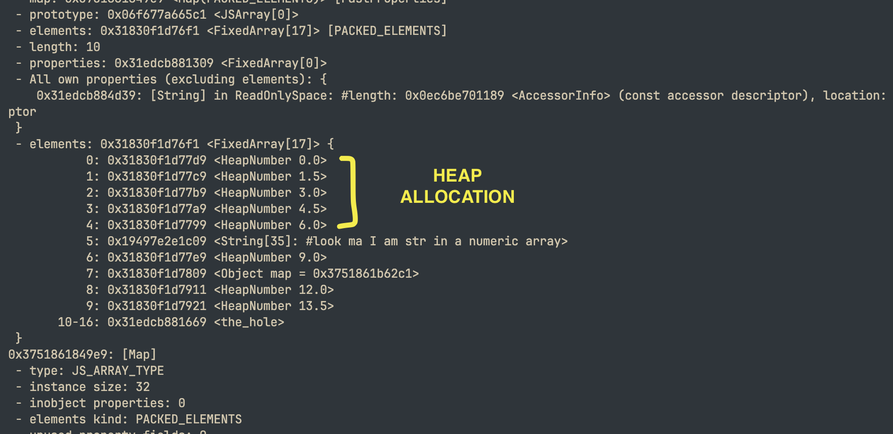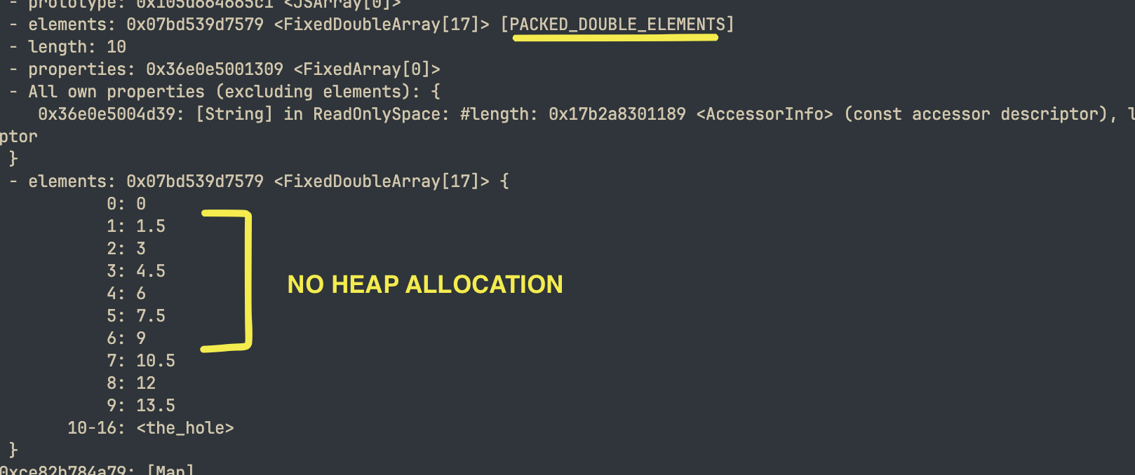 V8은 당신이 double(배정밀도 부동 소수점)만 저장하고 있다는 것을 감지하고 PACKED_DOUBLE_ELEMENTS를 사용합니다. 이는 힙 포인터가 아닌, 박싱되지 않은(Unboxed) 64비트 부동 소수점의 연속된 배열입니다. C 배열과 똑같이 메모리에 나란히 놓인 순수 IEEE 754 double 값들입니다.
