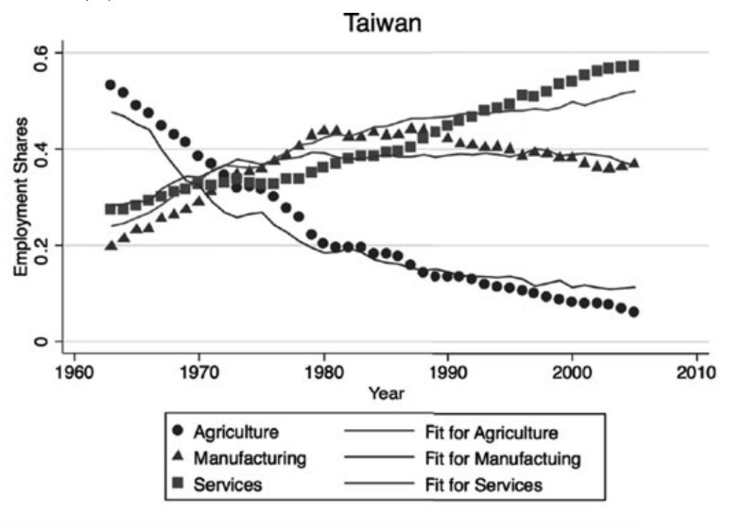 그림 1: 대만의 섹터별 고용 비중. 고용은 GDP 기여도를 밀접하게 추종합니다. 농업은 감소하고, 제조업은 상승 후 하락하며, 서비스업은 꾸준히 상승합니다.