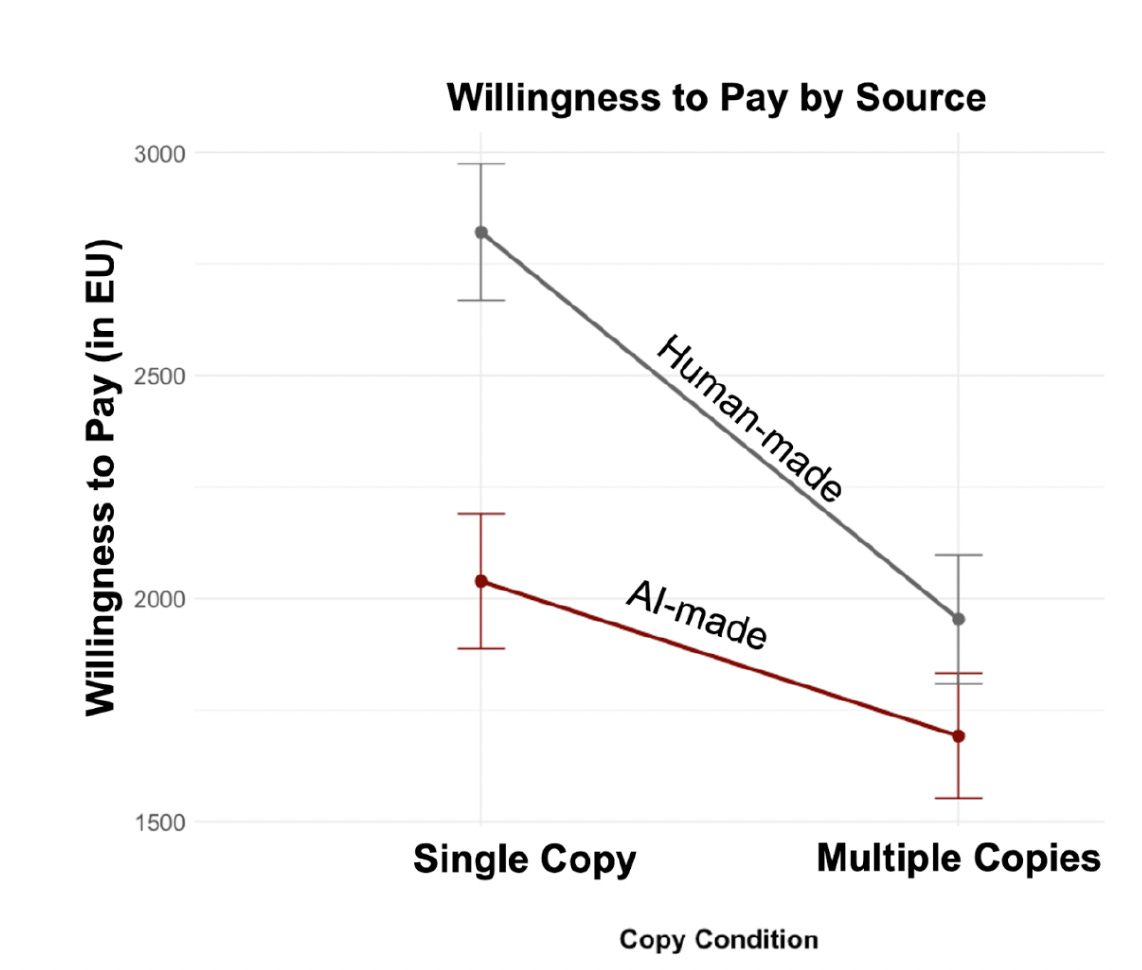 AI와의 결정적인 연결 고리는 그레일린 만델(Graelin Mandel)과 함께한 새로운 연구에서 나옵니다. 우리는 AI의 개입이 재화의 인지된 독점성을 훼손한다는 사실을 발견했습니다. AI가 개입된 대상은 본질적으로 복제 가능하고 고유하지 않은 것으로 인식됩니다. 사람들은 AI 개입 정도가 다르게 설명된 실물 예술 프린트에 입찰했습니다. 인간이 만든 작품은 독점성(단 한 점 대 여러 점)으로 인해 가치가 44% 상승했지만, AI가 생성한 작품은 그 절반도 안 되는 21%만 상승했습니다. 단순히 AI가 관여했다는 사실만으로도, 작품이 몇 점 존재한다고 말하든 상관없이 언제든 복제될 수 있는 것처럼 느껴지게 하여 본질적인 독점성을 잃게 만든 것입니다.