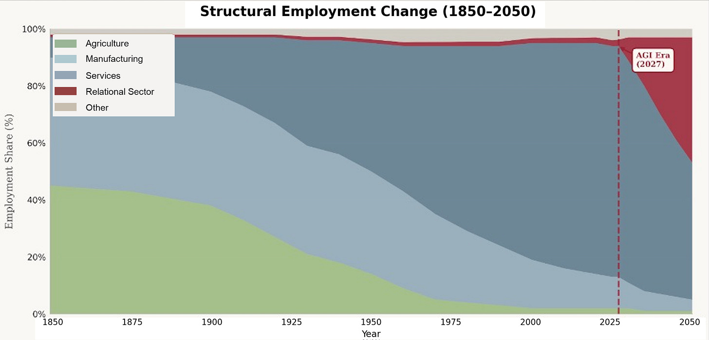 이 가설이 맞다면 AI는 단순히 상품 경제를 자동화하는 데 그치지 않을 것입니다. AI는 새로운 것, 즉 지출의 점점 더 많은 부분이 그 서비스를 제공한 인간과 가치를 분리할 수 없는 재화와 서비스로 향하는 '포스트 상품 경제(post-commodity economy)'의 등장을 촉발할 것입니다. 미국 노동력의 40%를 농장에서 공장과 사무실로 이동시켰던 것과 동일한 경제적 힘이, 노동자들을 자동화 가능한 상품 생산에서 제가 **관계형 섹터(relational sector)**라고 부르는 곳으로 이동시킬 것입니다. 여기서 관계형 섹터란 인간 집약적이고, 출처(provenance)가 풍부하며, 때로는 장인 정신이 깃든 경제 부문을 의미하며, 인간적 요소 자체가 재화나 서비스 가치의 일부가 되는 곳입니다. 희소성의 경제학은 사라지지 않고 그 위치만 옮겨갈 뿐입니다.