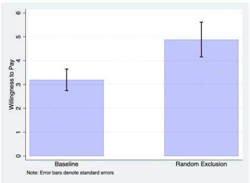 크리스토프 마다라스(Kristof Madarasz)와 필자는 기본적인 경제 교환의 맥락에서 선호의 모방적 차원을 뒷받침하는 근거를 제시했습니다. 우리는 먼저 타인이 원하지만 가질 수 없을 때 재화에 대한 욕망이 증가한다는 공식 모델을 개발했습니다. 이는 진정한 배제(exclusion)가 있을 때, 즉 특정 대상에 대한 접근이 희소하고 타인들이 그것을 갈망하게 될 때 사람들이 그것을 더 가치 있게 여길 것이라고 예측합니다. 우리의 실험에서 피험자들은 제품 자체가 동일함에도 불구하고, 무작위로 선정된 일부 사람들이 제품에서 배제될 것이라는 사실을 알게 되었을 때 지불 의사가 대략 두 배로 증가했습니다(아래 그림 2). 이는 지위 과시(피험자들은 익명이었음)나 희소성 휴리스틱(배제는 무작위였음) 때문이 아니었습니다. 순수하게 타인이 갖지 못한 것을 소유하려는 선호에 의해 주도된 결과였습니다.