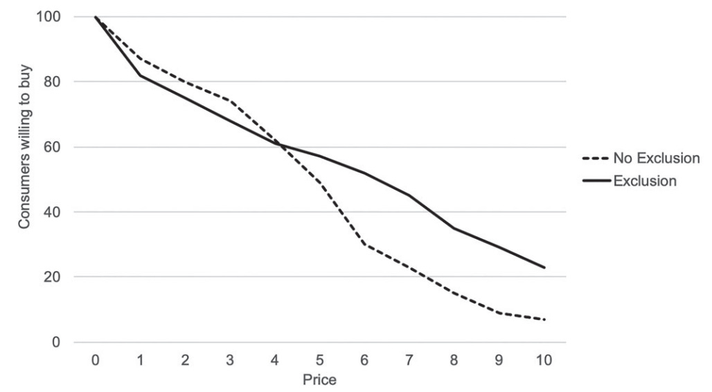 우리는 또한 모방적 선호의 함수로서 실제 수요 곡선을 도출하는 실험도 진행했습니다. 배제의 가능성이 높아짐에 따라 수요 곡선이 오른쪽으로 크게 이동하는 것을 볼 수 있습니다(그림 3). 그 효과는 작지 않습니다. 중앙값 지불 의사가 다시 한번 거의 두 배가 됩니다!